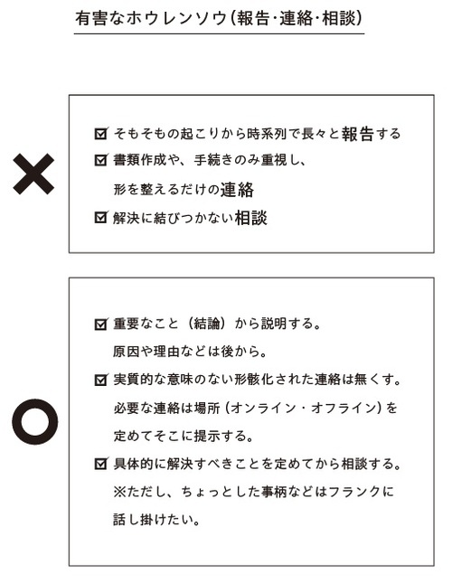 形を整えるだけの「ほうれんそう」はむしろ有害です。これによって事務仕事ばかりが増えて、時間が取られます。本当にしなくてはいけないことができなくなることがあります。これでは本末転倒です。何のためにするかが、大切なのです。