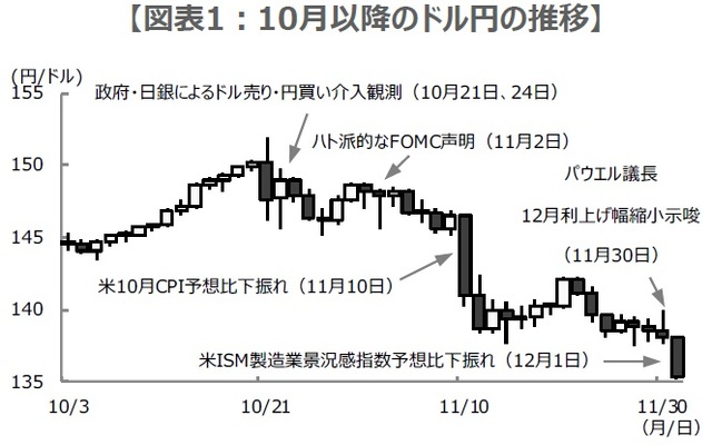 10月以降のドル円の推移をみると(図表1)、10月下旬に政府・日銀によるドル売り・円買い介入観測が浮上し、ドル高・円安の動きが一服すると、11月の米連邦公開市場委員会(FOMC)でのハト派的な声明を受け、緩やかにドル安・円高が進行しました。その後、米10月消費者物価指数が予想比下振れとなり、11月30日のパウエル議長の講演と、12月1日の弱めの米経済指標を受け、一段とドル安・円高が進行しました。