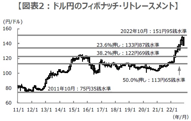 そこで、テクニカル分析の1つであるフィボナッチ・リトレースメントで、ドル安・円高の目安を考えます(図表2)。
