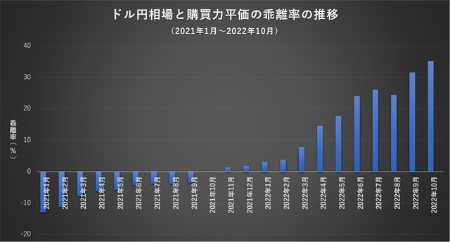 今回の円安は米国のインフレが発端であり、図のように購買力平価からの実際の相場の円安方向への乖離率は大きいのですが、この乖離は3~5年かけて徐々に縮小すると思われます。なお、購買力平価は日米のインフレ率の差を反映して円高方向(119.11円[2021年1月]から108.87円[2022年10月])に推移しました。
