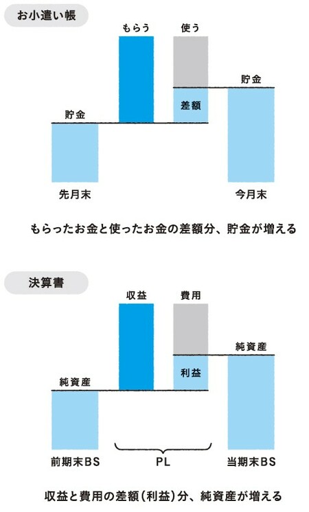 フローがつみかさなってストックになるのは、お小遣い帳も決算書も同じです。違うのは、お小遣い帳の残高は現金だけなのに対し、決算書にはさまざまな資産・負債の残高があるという点です。現金が増えなくても、資産が増える取引であれば、PLで収益が計上されます。