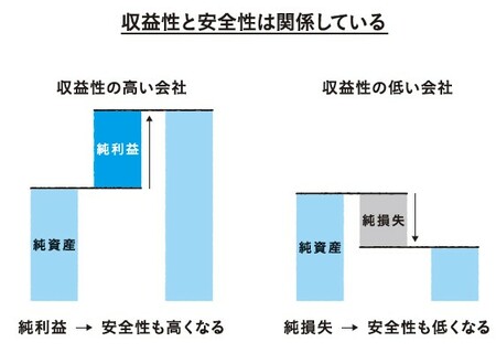 収益性が高く、多くの純利益を計上すると、純資産が増え、安全性が高くなります。安全性が高い会社というのは、それまでに利益を計上してためてきた会社が多いのです。逆に、収益性が低く、純損失を計上すると、純資産は減り、安全性も下がってしまいます。