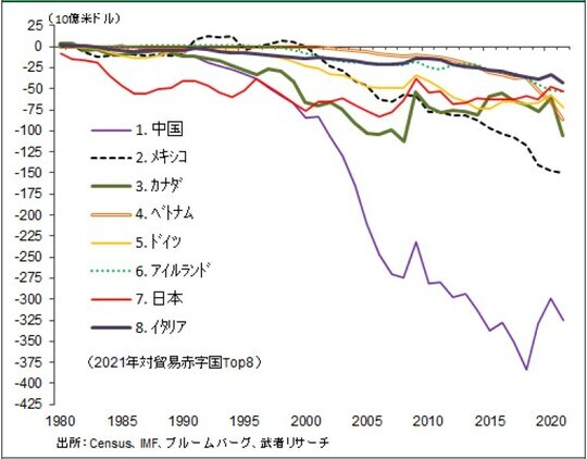 [図表5]にみるように米国の対外赤字は、対中で減少に転じているのに、メキシコ、ベトナム、カナダ、アイルランドなどに対して大きく増加し、米国の経常赤字は年率1兆ドルベース、対GDP比で4%に達している。