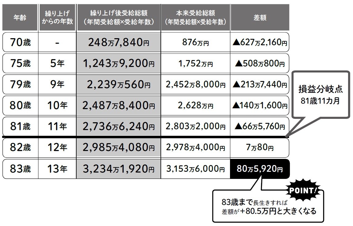本来年金額175万2,000円の人が70歳まで繰り下げした場合の損益分岐点は81歳11カ月。82歳から、繰り下げ受給総額が本来の受給総額より多くなります。83歳まで生きると、その差が80万円以上大きくなります。