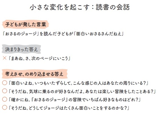 このような交流によって、本を1冊読み通すときに交わす会話以上に、豊かな会話が生まれます。確かに、普通の読み聞かせに比べれば読める冊数は少ないでしょう。それどころか、1冊も読み通せないかもしれません。でも、読書は入り口であって、アイデアを語り合うことに意味があるのです。そのほうが、子どもは読書にはるかに積極的になります。