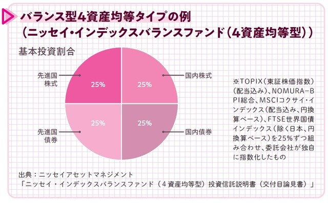 図表3の「ニッセイ・インデックスバランスファンド(4資産均等型)」は、国内株式、外国株式、国内債券、外国債券の4資産に25%ずつ均等に配分した4資産均等タイプです。債券の割合が50%を占めていることが特徴的で、株式型と比べるとよりローリスクの運用を期待できます。