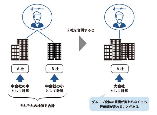 しかし会社規模が一定以下の場合には類似業種比準価額方式を組み入れることができる割合が少なくなり、純資産が高い会社は自社株式の評価が高くなってしまいます。そこで複数の会社を保有している場合で、会社を合併することにより類似業種比準価額方式の割合を増やすことができる場合には、合併を行うことで自社株式の相続税評価額を大きく引き下げることができます。