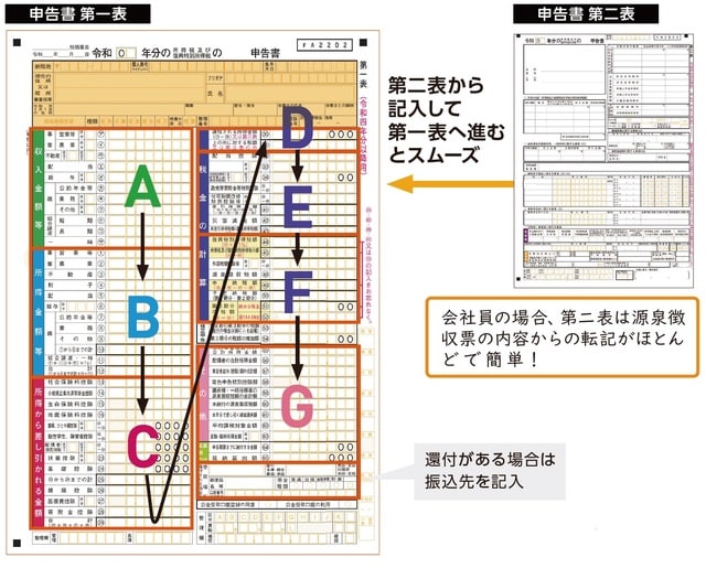 第二表から記入して第一表へ進むとスムーズです。会社員の場合、第二表は源泉徴収票の内容からの転記がほとんどです。