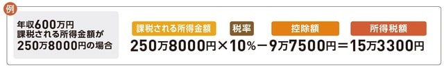 例えば、会社員で年収600万円、その他の収入がないと仮定し、課税される所得金額を250万8000円として速算表に当てはめて計算します。すると、税率は10%、控除額が9万7500円で、所得税額は15万3300円になります。この金額を㉛に記入すればOKです。