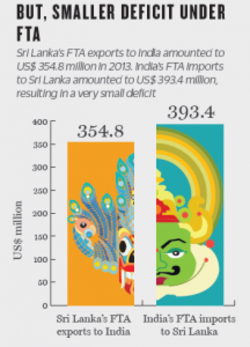 2013年、スリランカからインドへのFTAでの輸出は3億5680万米ドルに達した。インドからのFTAでの輸入は3億9340万米ドルであり、わずかな損失に収まった。