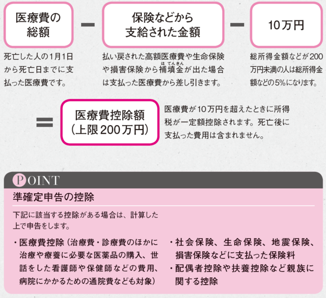 医療費控除の申請は確定申告と同時に行い、領収書など医療費としての支出を証明する書類の提出が必要です。故人の医療費は死亡日までに支払った金額の合計を計算するため、亡くなった後に支払う入院費は控除されません。