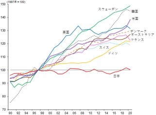 しかし労働報酬をそれ以上に抑制し、それによって企業利益が確保された、という連鎖が起きた。日本の実質賃金が過去30年間まったく上昇せず、デフレに陥ったが(図表6)、その起点は、円高下での企業の価格競争力維持の努力にあったといえる。