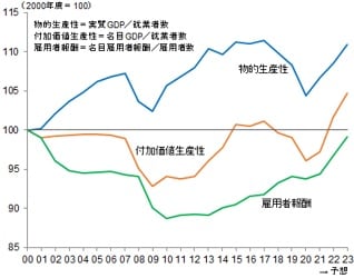図表5は企業における1人当たりの物的生産性、付加価値生産性、労働報酬の推移であるが、日本企業は世界的技術発展の恩恵を受け、物的生産性をそれなりに上昇させてきた。にもかかわらず、円高とデフレによる販売価格低下により、企業には生産性上昇の果実が残らず、付加価値生産性は横ばいであった。