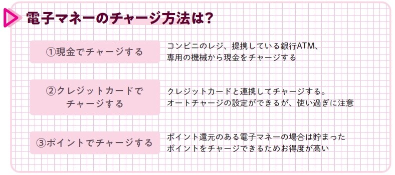 電子マネーは、コンビニやドラッグストアなどのレジ、銀行ATM、駅の券売機などで、現金でチャージできます。手続きすれば、クレジットカードからもチャージできるようになります。チャージのたびにクレジットカードのポイントが貯まるのでお得です。残金が一定額以下になれば自動でチャージされるオートチャージも設定できます。