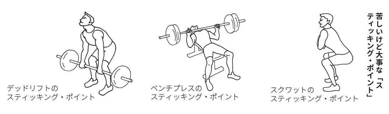 ベンチプレスだと胸から上げ始めて10㎝ほど、ちょうど肘が直角になるあたりがスティッキング・ポイントになる。デッドリフトなら最初の動き出しから、股関節の伸ばし始めあたりがいちばん辛い。ただしこれらの場所については多少の個人差があるようだ。