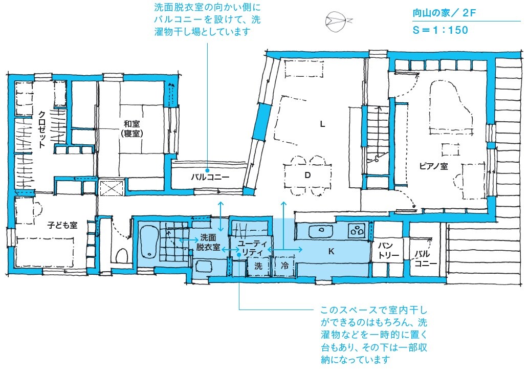 リビングや和室(寝室)とつながる2階全体の回遊動線の一部にすることで、水廻りの家事は格段に便利になります。