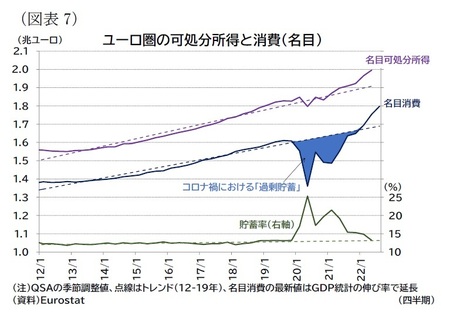 家計にはコロナ禍期間中に消費が抑制されていたことによる「過剰貯蓄」があり、そのため、高インフレ下でも家計購買力を維持するバッファーになっている(図表7)。ただし、貯蓄率はすでにコロナ禍前の水準まで低下しており、今後はインフレの負担感がさらに増すものと見られる。