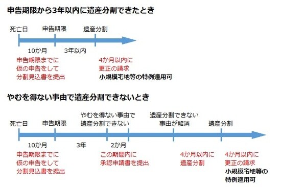 仮の申告では小規模宅地等の特例は適用できませんが、分割見込書を出しておくと、3年以内に遺産分割ができれば更正の請求で小規模宅地等の特例が適用できます。更正の請求の期限は、遺産分割ができた日の翌日から4ヵ月以内です。