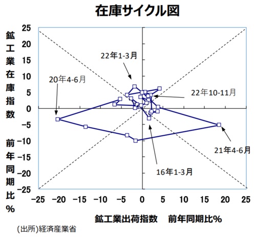 ●鉱工業全体の在庫循環の動きをチェックするために、縦軸に鉱工業在庫指数・前年比、横軸に鉱工業出荷指数・前年比をとった在庫サイクル図をつくると、20年10~12月期、21年1~3月期では「意図せざる在庫減局面」に、4~6月期、7~9月期では「在庫積み増し局面」だった。10~12月分では、「在庫積み上がり局面」となった。22年1~3月期、4~6月期、7~9月期も「在庫積み上がり局面」継続となった。10~11月分では、在庫が前年比+3.8%、出荷が前年比+1.5%で、引き続き「在庫積み上がり局面」になっている。