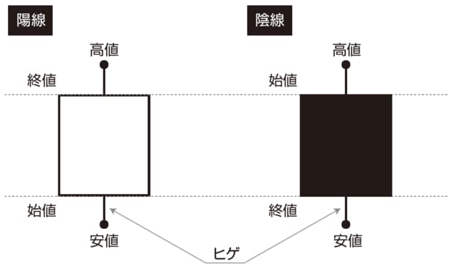 また、4つの価格情報に加え、例えば、白と黒といった対比される色付けがなされており、初めてみる人にとっては暗号のように思えるかもしれませんが、前日比の値動きだけでなく、日中の上昇や下落といった値動きを投資家に伝えてくれるものなのです。