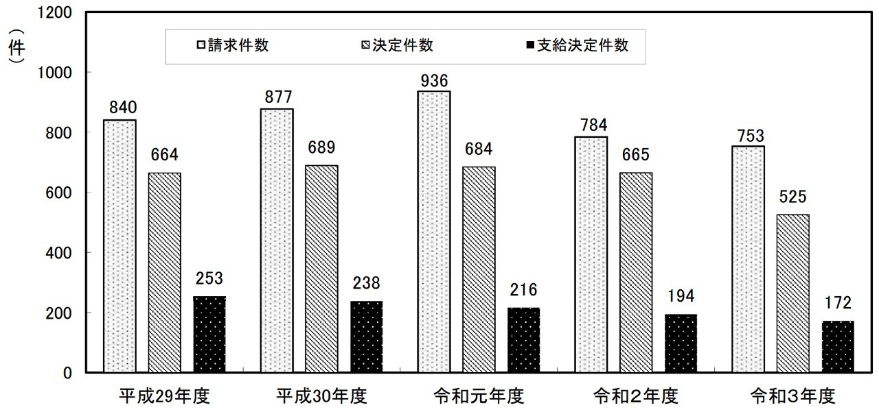 脳・心臓疾患の請求、決定及び支給決定件数の推移 (出典)厚生労働省「令和3年度の「過労死等の労災補償状況」