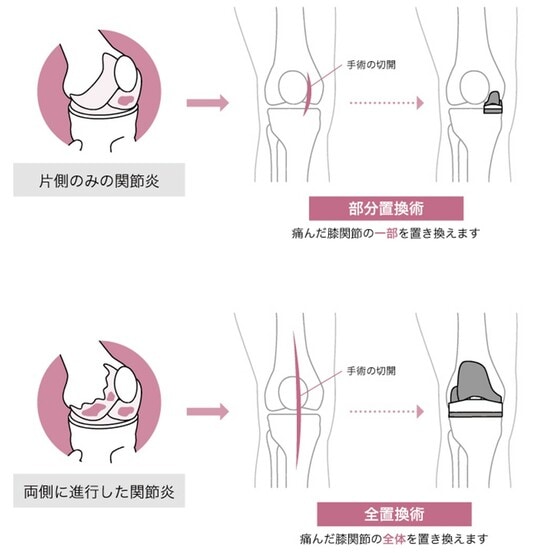 一般的に、60歳以上の方に対して行われる手術で、変形した膝関節の表面を薄く削り、人工関節に置き換える治療法です。手術ではひざの前面を切開し、大腿骨や脛骨、場合によっては膝蓋骨の痛んだ部分を削ります。