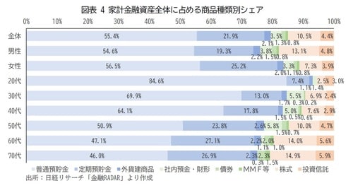 金融資産全体に占める商品種類別のシェアをみると、全体では「普通預貯金」が55.4%で最も多く、「定期預貯金」(21.9%)、「株式」(10.5%)の順で続いている(図表 4)。性別では女性で「定期預貯金」が25.2%と男性に比べ高く、男性で「株式」が13.1%と女性に比べ高くなっている。また、年代別では高齢層ほど「定期預貯金」「株式」のシェアが高くなっており、50代以上で「定期預貯金」は2割を、「株式」は1割を、それぞれ超えている。