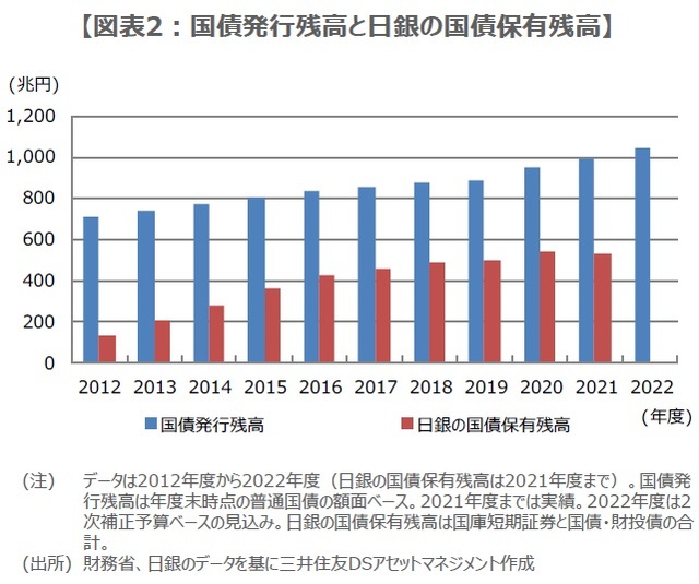 YCCは、10年国債利回りを低下させる効果が日銀から示されている一方、利回りの人為的な歪みが投機を誘いやすく、国債増発のなかで日銀の国債保有額が増加し(図表2)、国債市場の機能に影響を及ぼすという副作用があります。