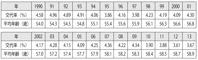 このような日本社会の高齢化の進行と連動して、社長の平均年齢も、この20年以上一貫して上昇し続けており、2013年には平均58.9歳と過去最高を更新しました。また、社長交代率(過去1年の間に社長の交代があった企業の比率)については、1994年に、4.06%に低下し、その後も低水準が続いています。