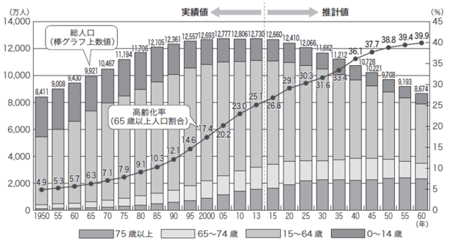 (注)1950~2010年の総数は年齢不詳を含む。高齢化率の算出には分母から年齢不詳を除いている。