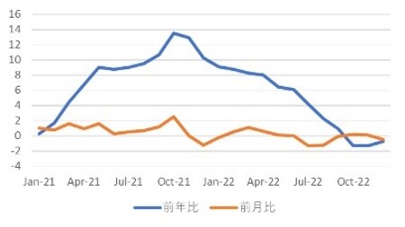2022年は通年のCPI上昇率も2.0%と政府の目標を掲げる「3%前後」からは遠い結果に終わった。12月の生産者物価指数も前年比0.7%下落と、下げ幅は前月比で縮小したものの3ヵ月連続のマイナスだった。