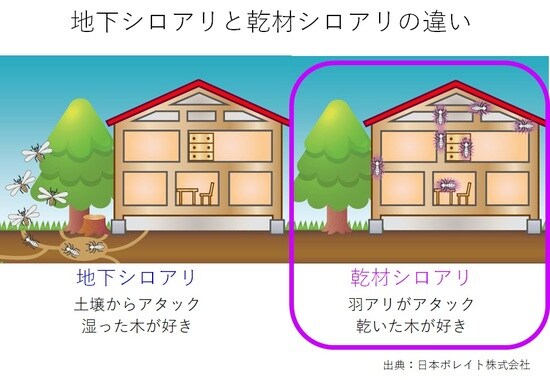 それに対して、アメリカカンザイシロアリは、名前の通り、乾いた木材に残されたわずかな水分で生息することができます。そのため、家の柱や梁などの構造材自体に巣を作り、その巣を家の中でどんどん広げていきます(図表4)。