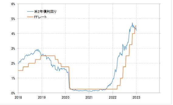 経験的に、利上げ局面では米2年債利回りはFFレートを上回って推移します。そんな米2年債利回りがFFレートを下回るのは、普通なら利上げの終了と利下げへの転換を織り込むところで起こる現象です。