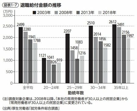 同調査では、従業員一人当たりの平均退職給付金額を集計している。それによれば、2003年に2,499万円あった退職給付金額は、2018年には1,788万円と、近年急速に減少している[図表1‒7]。退職金額が減少している背景には、バブル崩壊以降の低金利によって退職積立金が減少していること、などが影響している。