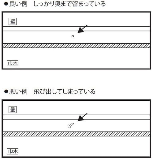 巾木は、“フィニッシュ釘”という頭の出ていない釘で留めるのですが、これが最後まで打ち込まれておらず、飛び出しているケースがあります。未処理のフィニッシュ釘は、とても危険です。
