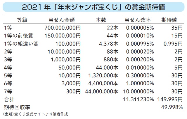 図表2は、2021年に行なわれた「年末ジャンボ宝くじ」の当せん金額と当せん確率をまとめたものです。