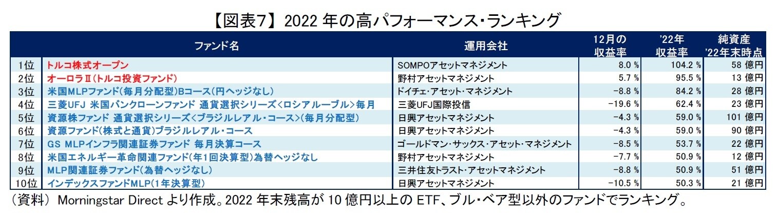 12月に高パフォーマンスであったファンドをみると、一部の新興国関連ファンド(赤太字)やテーマ型の国内株式ファンド(青太字)が好調であった【図表6】。トルコ株式ファンドについては12月だけなく2022年1年通しても好パフォーマンスで、この1年で基準価額がほぼ倍になった【図表7】。その他、2022年は資源関連ファンド(青太字)も総じて好調であった。