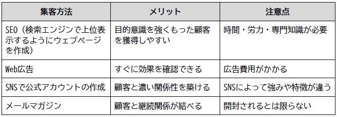 集客方法の主な例を4つ以下で紹介します。集客方法ごとのデメリットを知らないと失敗する恐れもあるため、あわせて確認しておきましょう。