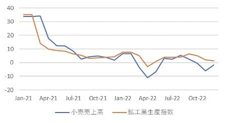 同日に発表された12月の小売売上高は前年比1.8%減と前月(5.9%減)から縮小したもの、マイナス成長は3ヵ月連続となった。同月の鉱工業生産は同1.3%増と前月から低下し、経済都市である上海市がロックダウンされた5月以来の低水準と厳しい数字となった。