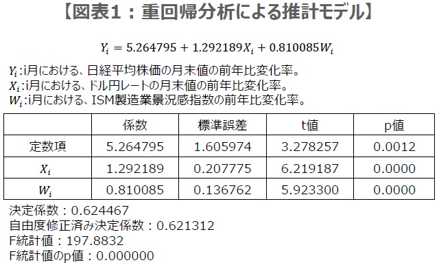 日経平均株価の変化率の推計式は、定数5.264795、係数1.292189×ドル円レートの変化率、係数0.810085×ISM製造業景況感指数の変化率で表されています。ドル円レートの係数1.292189が、日経平均株価の為替感応度であり、ドル円レートが前年比1%、ドル高・円安方向に変化すると、日経平均株価は前年比約1.3%上昇する関係が示されています。
