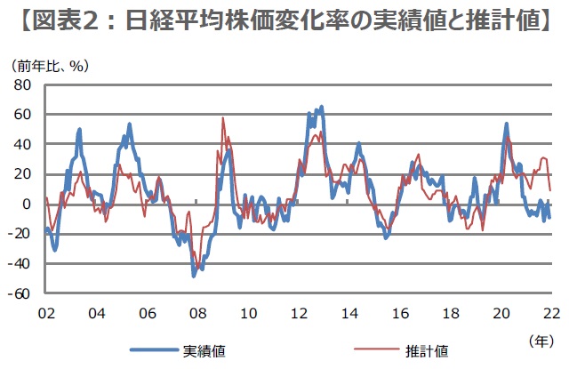 最後に、推計式の自由度修正済み決定係数をみると、0.621312となっています。これは、ドル円レートとISM製造業景況感指数の変化率で、日経平均株価の変化率を約62%説明できることを示します。つまり、他の要因が約38%あることから、この推計式だけで、日経平均株価の変化率を完全に説明することは困難といえます。ただ、過去の動きをみる限り、おおまかな変化の方向性は説明可能と思われます(図表2)。
