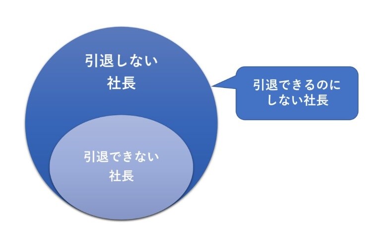 まず、「引退しない社長」のなかには、「引退できない社長」も含まれています。引退できない社長というのは、引退したくてもできない社長です。 「引退しない社長」と「引退できない社長」というのは、その理由は異なってきますので、別に考えることが大切です。