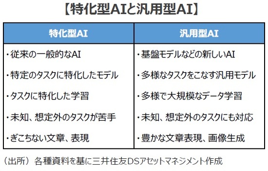 ■「基盤モデル」のような汎用型AIは、特化型とくらべて表現力が豊かで応用範囲も広く、学習データを大規模化するほど性能が向上するとされています。このため、今後のAI開発は特化型から汎用型へと移行し、これまでとは別次元の高度で多種多彩なAIが登場するものと期待されています。