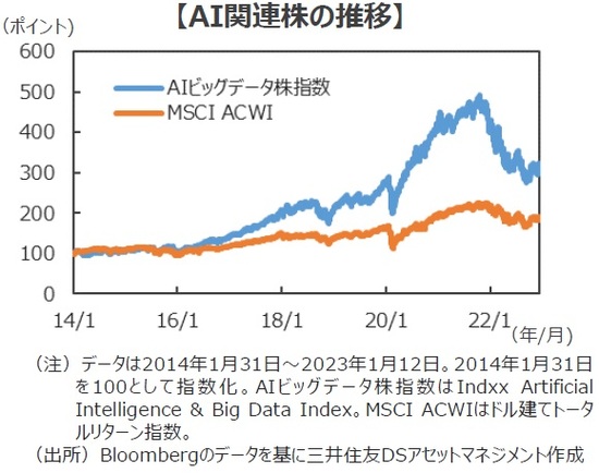 ■AI関連株の株価は2014年以降に約5倍まで上昇し、世界のハイテク・グロース株相場をけん引してきました。2022年は世界的な金融引き締めを受けたバリュエーション調整から軟調な展開となりましたが、そのケタ違いの経済効果を背景に、関連企業の業績は好調に推移しています。このため、今後インフレの減速により米国での利上げが一巡し、将来の利下げが取りざたされるようになると、AI関連株はハイテク株の戻り相場における本命の一つとして、市場参加者の注目を集める可能性が高そうです。