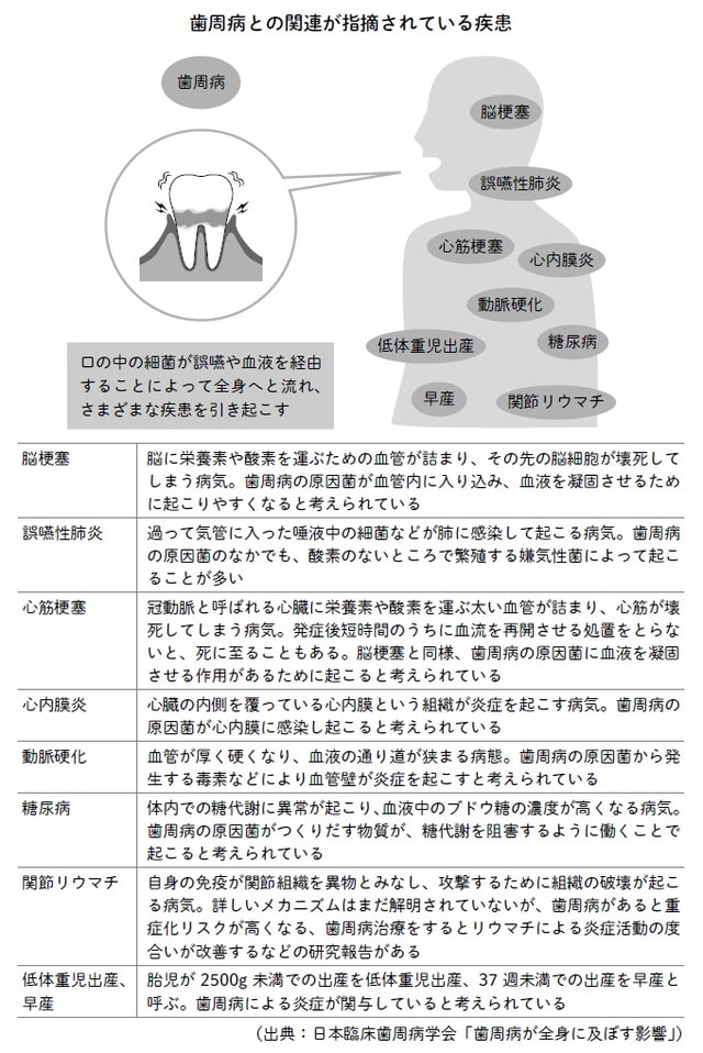 そのほかにも歯周病は心臓に栄養や酸素を送る血管が詰まってしまう「心筋梗塞」、脳の血管が詰まって起こる「脳梗塞」など突然死を引き起こす疾患や、肺炎や認知症、低体重児出産などさまざまな全身疾患のリスクがあることが分かってきています【図表】。