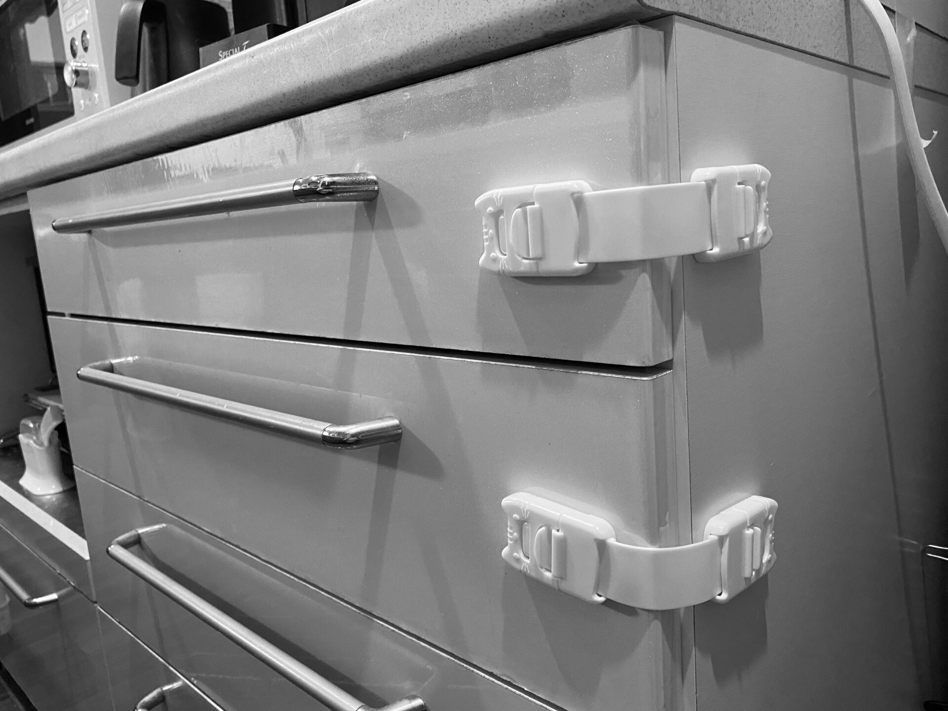 お皿をキッチンの引き出しに収納できるのなら、引き出しの飛び出しを防いでおけば大丈夫です。引き出しの扉に子どもの指挟みやいたずら防止用のストッパー(ドアロック)をつければOK。大阪府北部地震で被災したとき、わが家はこの対策で一枚もお皿を割らずにすみました。