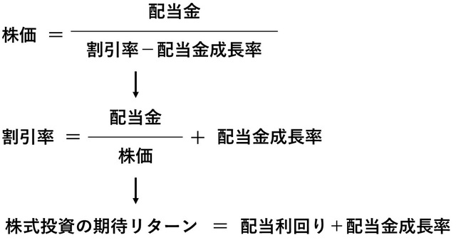 この考え方は「定率成長配当割引モデル」と呼ばれるものです。そして、図表のようにこの考え方は、「割引率」は、「配当利回り」と配当金成長率の合計の値であるということが導けます。