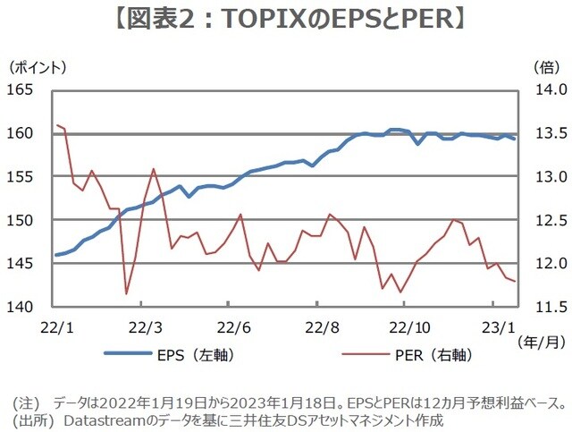 ただ、日銀が先週、金融緩和継続に強い姿勢を示したため、円高の進行ペースが幾分、鈍化する見方もでてきていることや、年初から米国株が堅調に推移していることは、日本株にとって好材料です。さらに今後、米景気や利上げに対する懸念が後退していけば、PERが切り上がる形での株高も期待されます。一方、業績改善によるEPSの上昇が主導する株高は、今後の決算内容を見極める必要もあり、もう少し時間がかかると思われます。