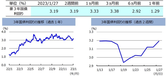 ここ2週間の豪州3年国債利回りは、低下局面はありましたが最終的にはほぼ変わらずとなりました。豪州の12月の雇用統計が弱含んだことや、米国経済の減速や米利上げ減速が意識されたことから、豪州の3年国債利回りは一時低下(債券価格は上昇)しました。しかし、25日に発表された豪州の10-12月期のCPIが市場予想を上回ったことから2月の金融政策決定会合での利上げ観測が強まり、豪州の国債利回りはほぼ同程度の利回り水準に戻りました。