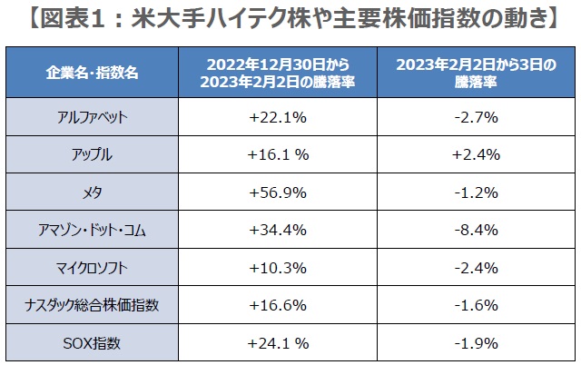 米国株式市場では、年初からハイテク株の回復基調が鮮明です。米大手ハイテク企業のGAFAM(グーグルの持ち株会社アルファベット、アップル、メタの旧社名フェイスブック、アマゾン・ドット・コム、マイクロソフト)は、2022年12月30日から2023年2月2日までの期間、軒並み2ケタの上昇率となっており、ハイテク株比率の高いナスダック総合株価指数も好調です(図表1)。